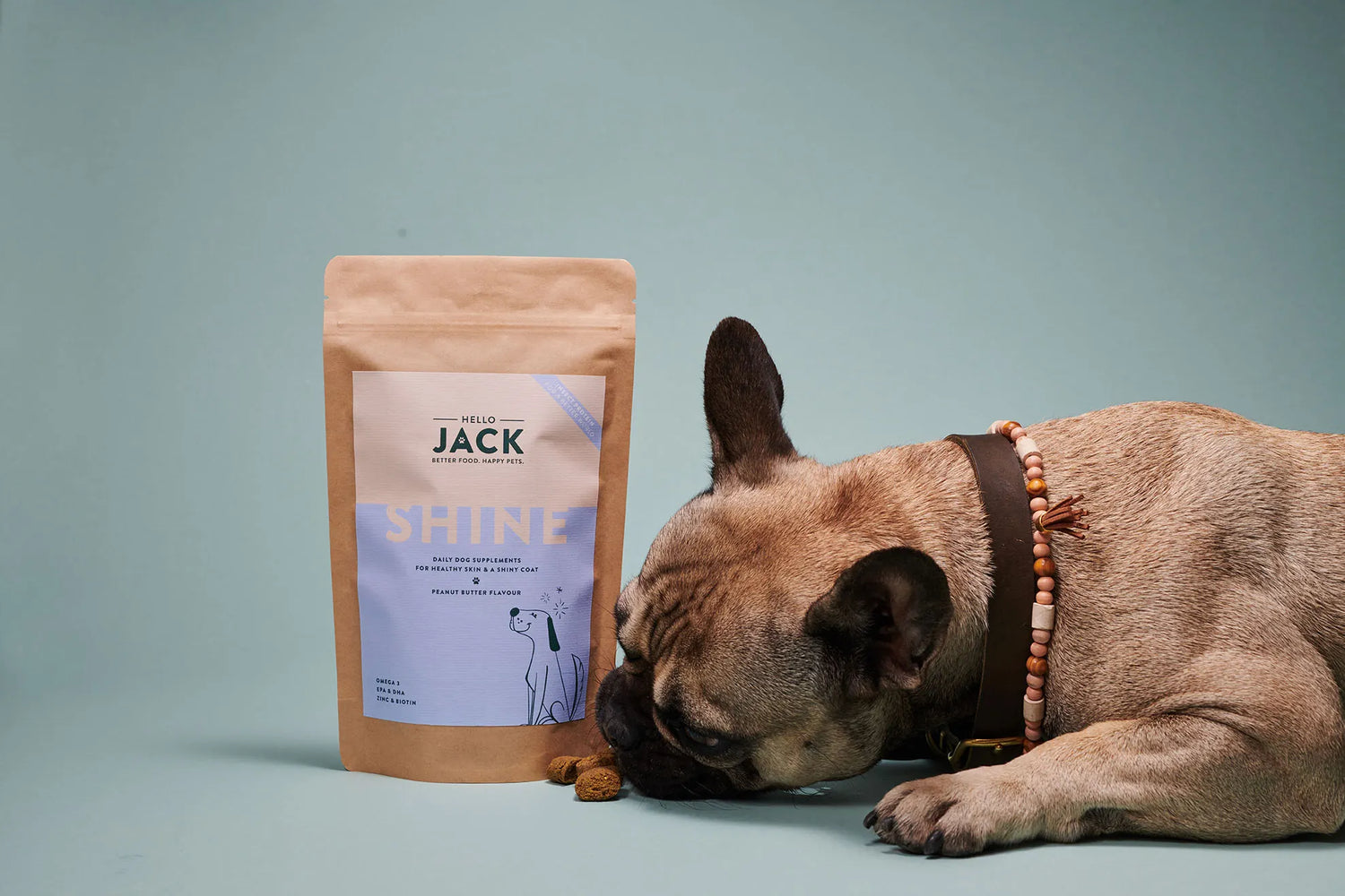 Ma bouledogue française souffre de dermatite atopique (prurit, croûtes, alopécie). Je ne voulais pas changer ses croquettes monoproteiques et sans gluten de haute qualité pour des croquettes soi disant indiquées pour sa maladie dont la composition est médiocre. D.ieu merci HelloJack Shine pelage existe et lui fait un bien fou. Ses poils derrière les oreilles ont repoussé, les croutes ont disparu, elle se gratte beaucoup moins. Elle prend aussi des gélules d’oméga 3. Bien sûr elle a aussi un traitement pour son otite chronique, elle a un immunosuppresseur et des lingettes désinfectantes à passer sur la peau pour gérer la prolifération de levures. Mais les compléments ont vraiment apporter un confort qu’elle n’avait plus. Bientôt on va tester une injection nouvelle CYTOPOINT qui éliminera la sensation de gratouille. Mais la gestion du maintien d une barrière cutanée cohésive qui permet son intégrité dans le temps ne se fera plus sans Hello Jack Shine.