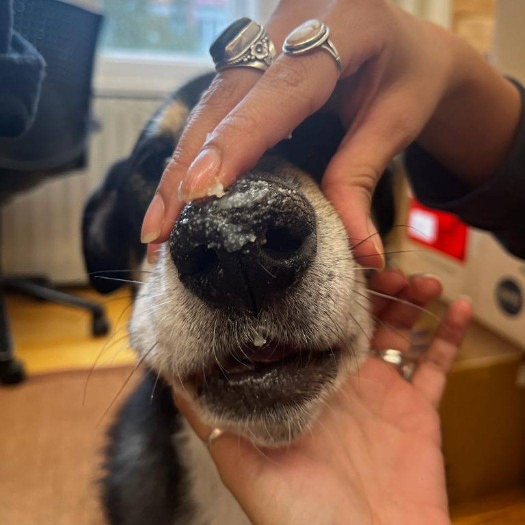 Les ingrédients qui sont dedans sont naturels. Ma toutoune est curieuse. Je n'ai pas de mal à lui appliquer sur la truffe.